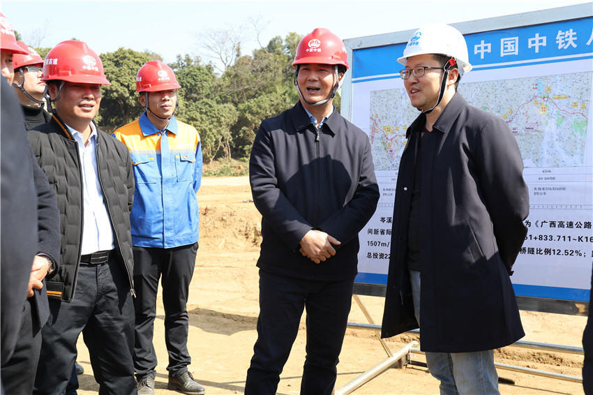 黃海韜查看了南橫項(xiàng)目第一合同標(biāo)段項(xiàng)目經(jīng)理部施工進(jìn)展情況,對(duì)現(xiàn)場(chǎng)施工進(jìn)度表示肯定。他指出南橫高速公路建設(shè)對(duì)橫縣經(jīng)濟(jì)發(fā)展至關(guān)重要,對(duì)沿線老百姓生活改善、提升沿線經(jīng)濟(jì)發(fā)展速度具有重大意義,縣委和政府各部門要多關(guān)心建設(shè)項(xiàng)目,多解決實(shí)際問題,為加快推進(jìn)項(xiàng)目建設(shè)掃清障礙;南橫高速公路公司和各建設(shè)單位要積極響應(yīng)國(guó)家和廣西壯族自治區(qū)對(duì)防疫工作提出的要求,切實(shí)抓好防疫工作,朝著建設(shè)精品工程、造福一方百姓目標(biāo)奮斗。