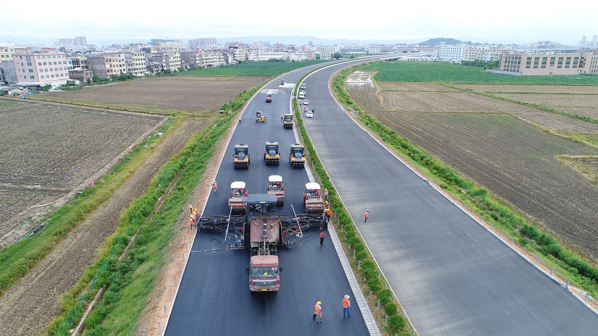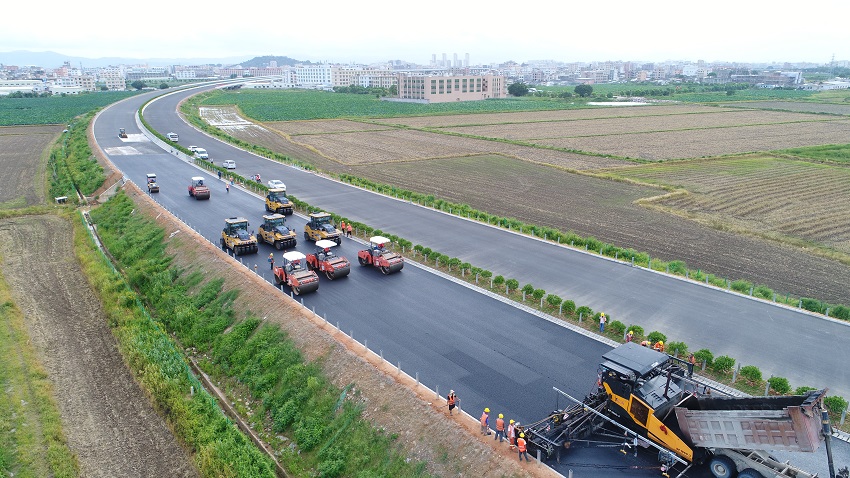 7月8日,汕揭項(xiàng)目第二作業(yè)面K27+750-K28+050段瀝青路面上面層試驗(yàn)段鋪設(shè)順利完成。