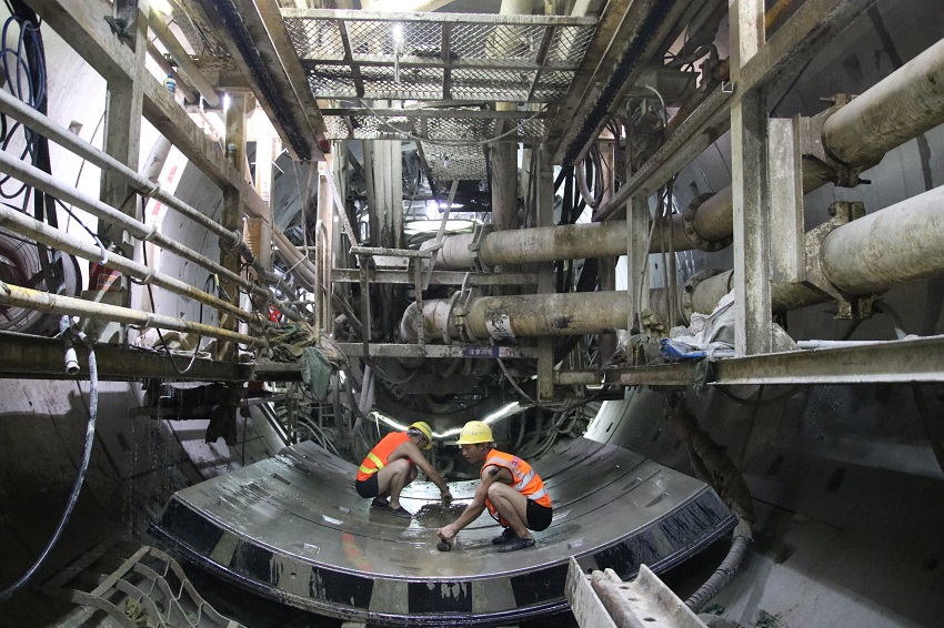 ▲施工人員調(diào)試盾構(gòu)機(jī)