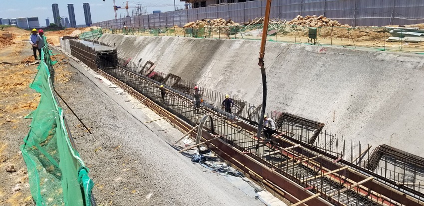 7月26日,旱塘主變電纜廊道現(xiàn)場(chǎng)呈現(xiàn)出熱火朝天的大干場(chǎng)面。指揮部指導(dǎo)工區(qū)加大資源投入,精心組織施工,拉開(kāi)了旱塘主變電纜廊道全面施工的序幕。旱塘主變電纜廊道總長(zhǎng)1791.59m,包括頂管段和明挖段,其中頂管施工383.5m,明挖施工1408.09m。截至目前頂管段:1號(hào)接收井設(shè)計(jì)10.735m,累計(jì)開(kāi)挖2.0m;2號(hào)始發(fā)接收井設(shè)計(jì)16.924m,累計(jì)開(kāi)挖8.3m;3號(hào)井設(shè)計(jì)25.461m,累計(jì)開(kāi)挖11.5m;4號(hào)井設(shè)計(jì)12.535m,已完成開(kāi)挖;明挖段溝槽累計(jì)開(kāi)挖120m,底板混凝土澆筑累計(jì)完成110m,頂板混凝土澆筑累計(jì)完成60m。