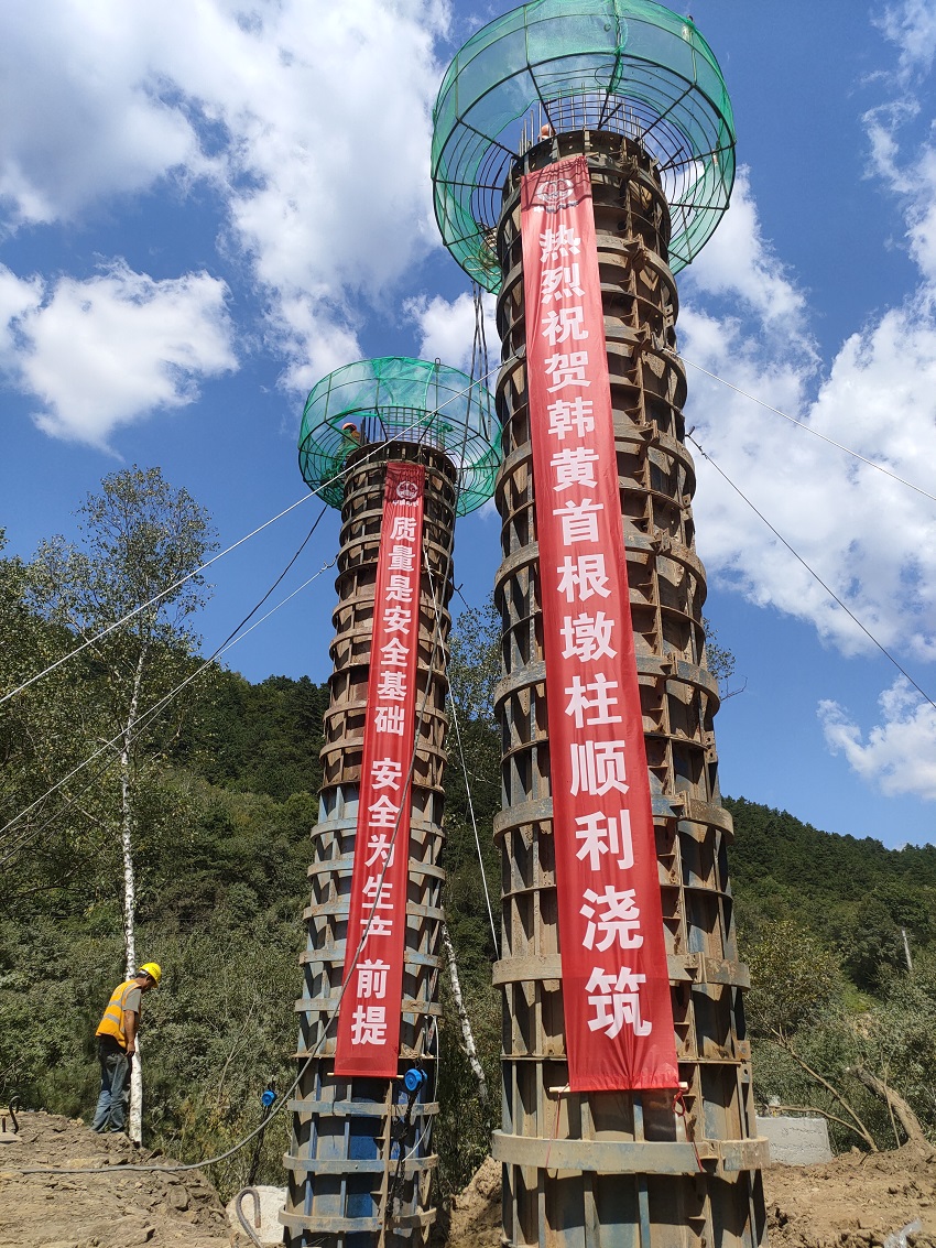 同日,韓黃高速公路項(xiàng)目重點(diǎn)工程沙曲河互通式立交B匝道橋第一根墩柱順利澆筑完成,是全線施工以來順利澆筑的首根墩柱。
