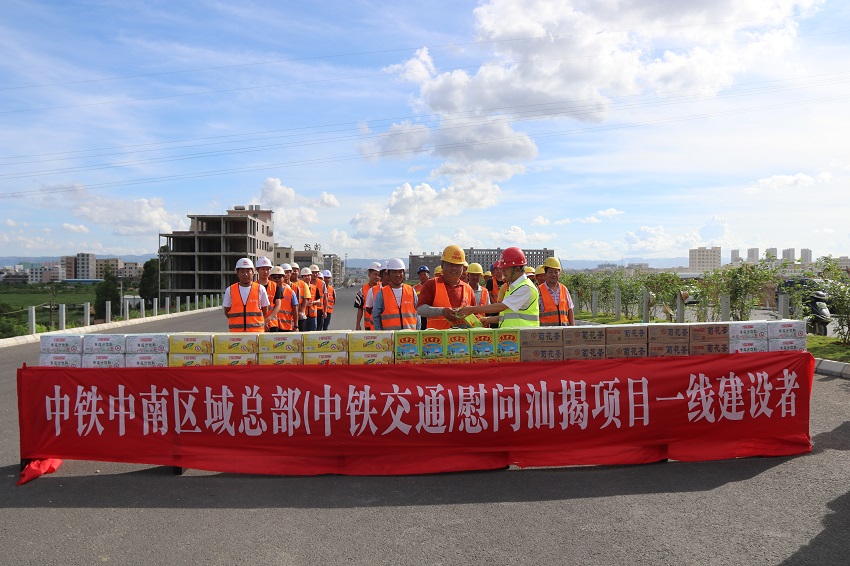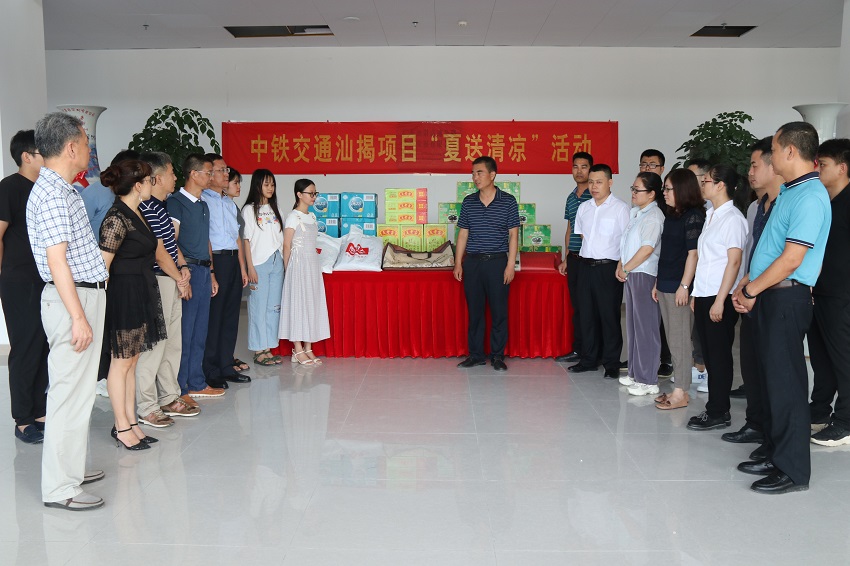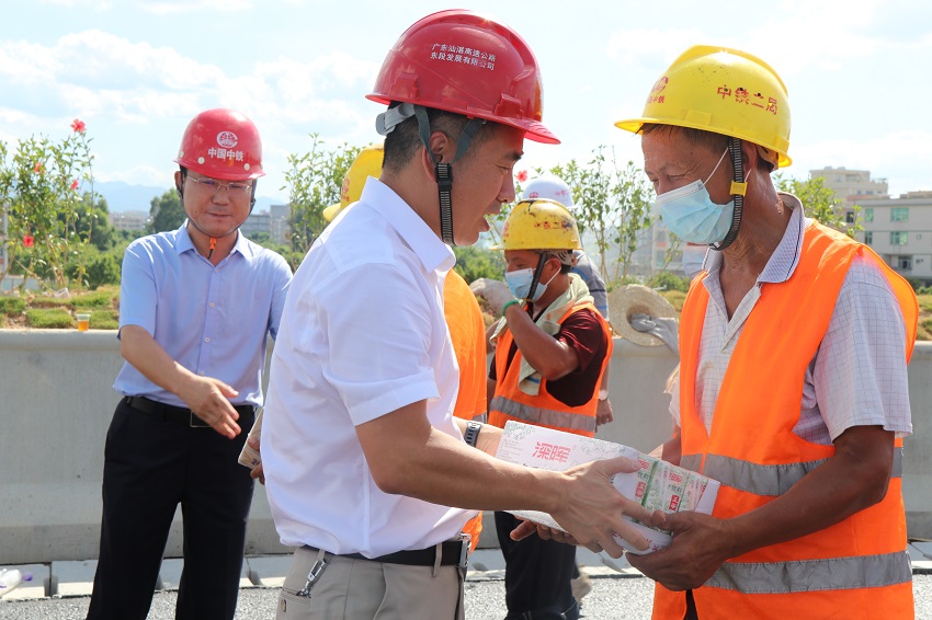7月,集團(tuán)公司副總經(jīng)理劉寧到汕揭項(xiàng)目為在高溫地區(qū)作業(yè)的一線建設(shè)者送清涼,將飽含關(guān)懷的清涼用品遞給每一位一線建設(shè)者,并仔細(xì)了解、問(wèn)候他們的工作生活情況。