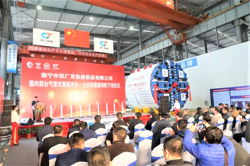 ▲國內(nèi)首臺(tái)氣墊式直排泥水—土壓雙模盾構(gòu)機(jī)在南寧下線
